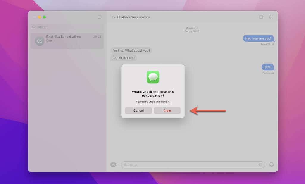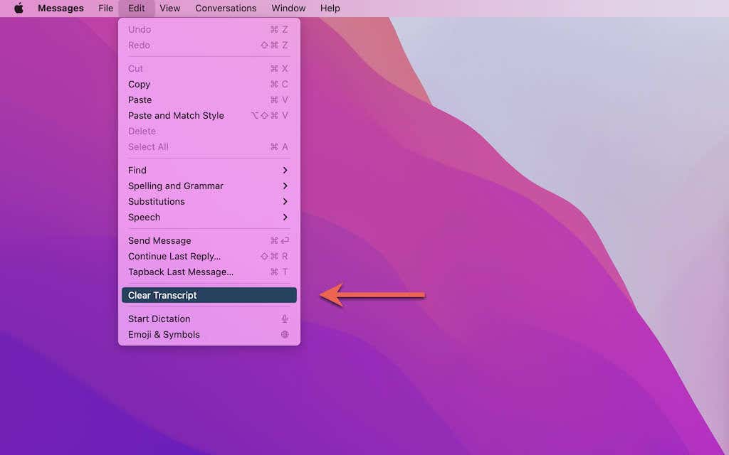 Alternativamente, puede optar por eliminar todos los mensajes en una transcripción mientras mantiene el hilo visible en la barra lateral de Mensajes(Messages) . De esa manera, puede enviar mensajes más tarde sin tener que crear una nueva conversación desde cero.