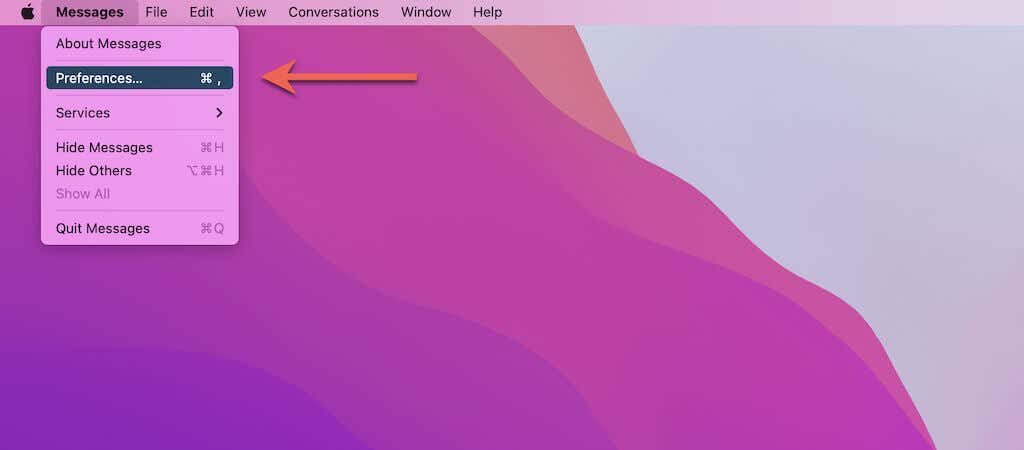 1. Abra la aplicación Mensajes(Messages) y seleccione Mensajes(Messages) > Preferencias(Preferences) en la barra de menú.