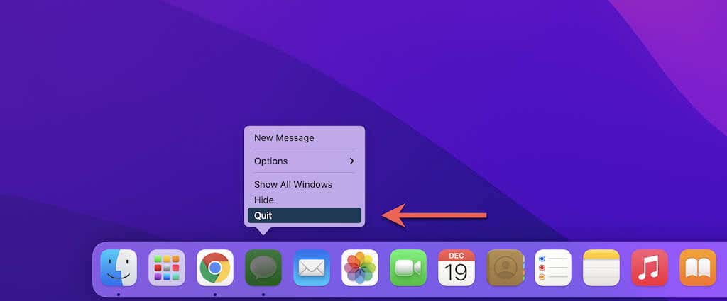 1. Haga clic con la tecla Control presionada o haga clic con el botón derecho en el ícono Mensajes(Messages) en el Dock y seleccione Salir(Quit) .