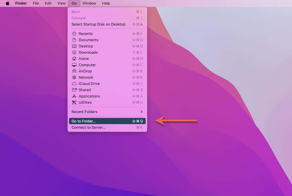 2. Abra Finder y seleccione Ir(Go) > Ir a la carpeta(Go to Folder) en la barra de menú.