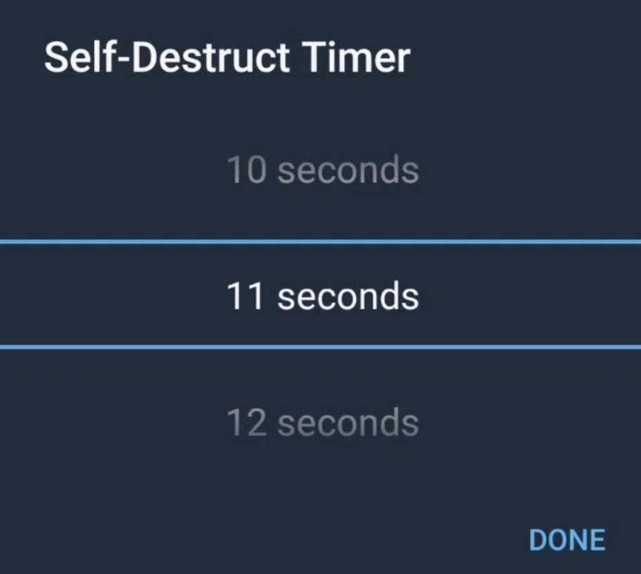 Con el temporizador de autodestrucción(self-destruct timer) , los mensajes desaparecerán automáticamente de tu chat secreto después de un tiempo establecido(set time) . También desaparecerán del dispositivo de la otra persona, así como del servidor de Telegram(Telegram server) .