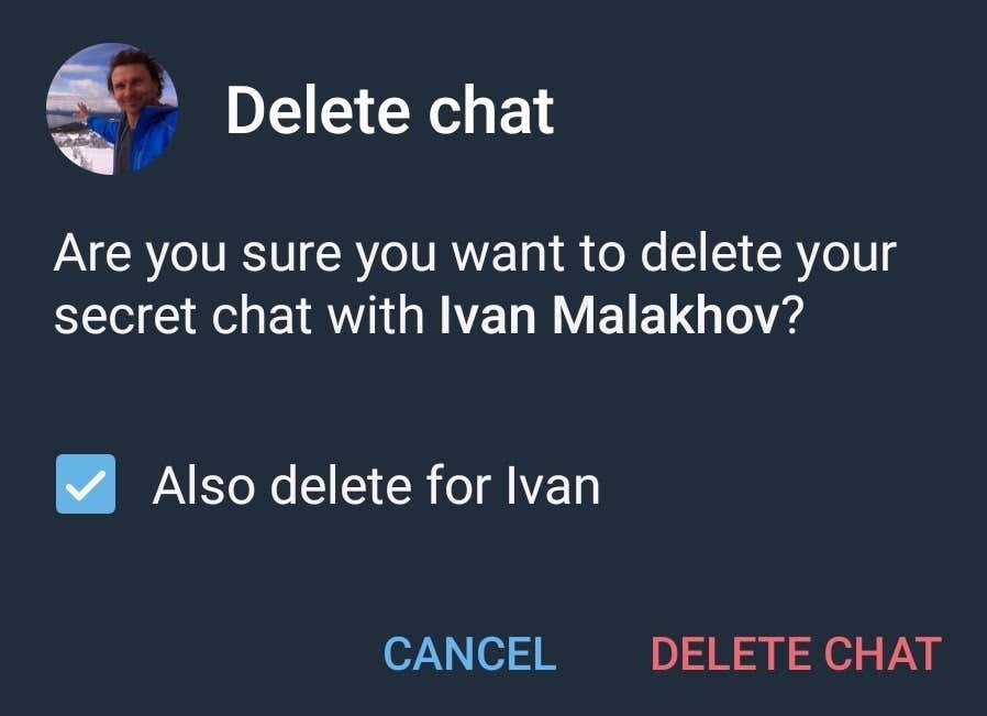 Si quieres deshacerte de una conversación completa en Telegram , abre la aplicación y selecciónala. Luego seleccione el icono de la papelera(bin icon) en la parte superior de la pantalla. Verá un mensaje emergente que le preguntará si desea eliminar el chat solo para usted o para usted y el destinatario. Si eliges esto último, el chat desaparecerá tanto de tus dispositivos como del servidor de Telegram(Telegram server) .