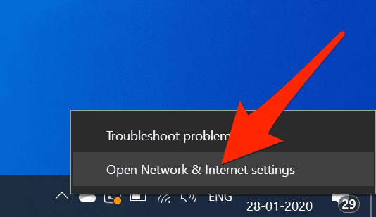 - Haga clic(Right-click) con el botón derecho en el ícono de red(network icon) en la bandeja del sistema y seleccione (system tray and select) Abrir configuración de red e Internet(Open Network & Internet settings) .