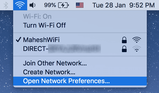- Haz clic(Click) en el ícono WiFi(WiFi icon) en la barra de menú de Mac(Mac menu) y selecciona la opción que dice Abrir preferencias de red(Open Network Preferences) . Abre la configuración de su red.