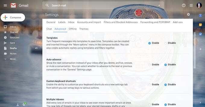 - luego ve a Avanzado(Avanzado) y haga clic Encender(Activado) junto a la opción Plantillas. (Plantillas)Desplazarse(Desplazarse) Desplácese hacia abajo en la página para guardar los cambios.
