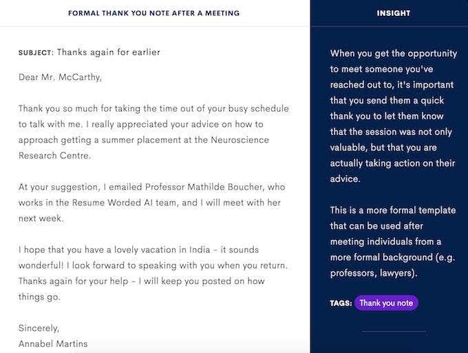 Hecho por currículum verbal , correos electronicos de la red es un gran recurso para optimizar la comunicación. Algunos ejemplos de plantillas que ofrecen incluyen una presentación cálida/fría, seguir contactando a alguien que no responde e incluso escribir notas de agradecimiento.