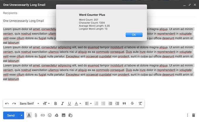 atracción(atracción) texto en un correo electrónico y obtenga la cantidad de palabras y caracteres que usó con un solo clic. Luego puedes continuar escribiendo el tuyo escribir o terminar(correo electrónico o envoltura) antes de que se convierta en dos partes.