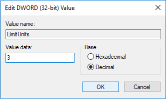 6.Haga doble clic en LimitUnits DWORD , luego seleccione Decima l en Base y cambie su valor de la siguiente tabla para tener un límite de cuota predeterminado que estableció en los pasos anteriores como KB, MB, GB, TB, PB o EB,( change it’s value from the below table to have a default quota limit you set in above steps as KB, MB, GB, TB, PB, or EB,) y haga clic en Aceptar .