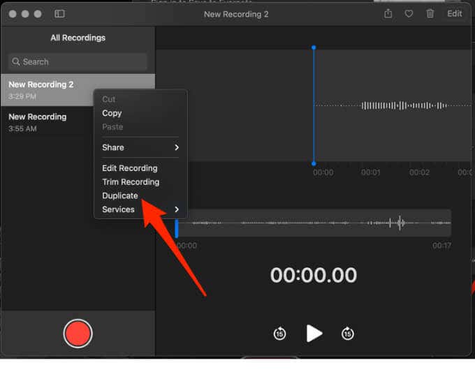 - Para duplicar su grabación de audio, haga clic derecho en la grabación en Notas de voz(Voice Memos) y seleccione Duplicar(Duplicate) .