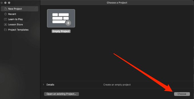 - Para grabar audio en Mac usando GarageBand , seleccione Ir(Go) > Aplicaciones(Applications) > GarageBand y luego seleccione Elegir(Choose) para abrir un nuevo proyecto.