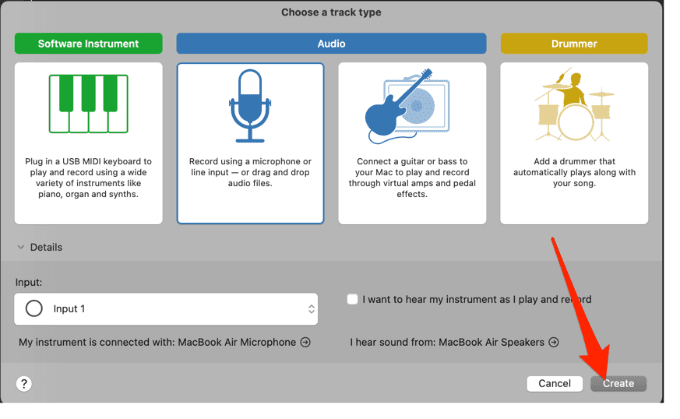 - En la ventana Elegir un tipo de pista , seleccione (Choose a Track Type)Audio > Grabar(Record) usando un micrófono.