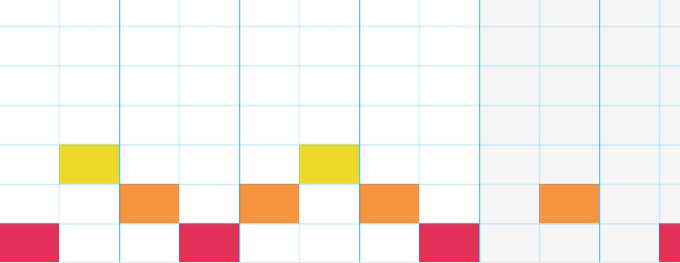 Las líneas azules gruesas cada dos cuadros representan un tiempo. Las secciones grises y blancas alternas indican compases musicales.(Alternating)
