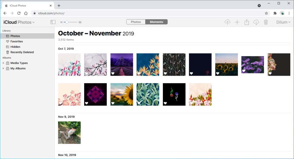 La aplicación web iCloud Photos te permite acceder a todas las fotos de las que has hecho una copia de seguridad con un iPhone o Mac . Tiene dos pestañas en la parte superior de la pantalla para cambiar entre los modos de visualización Fotos(Photos ) y Momentos . (Moments )El primero muestra imágenes en una lista continua, mientras que el segundo las desglosa por fecha y ubicación.