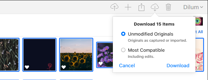 Pero si prefieres descargar tus fotos en el formato HEIC original(photos in the original HEIC format) , primero debes hacer clic y mantener presionado el ícono Descargar . (Download )Luego, elija la opción Originales sin modificar(Unmodified Originals) y seleccione Descargar(Download) .