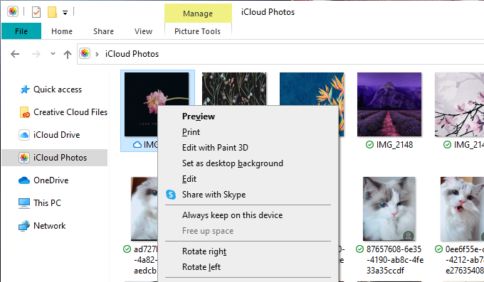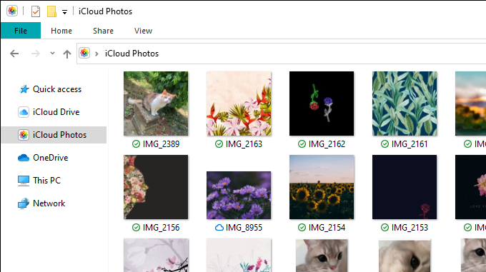 De manera predeterminada, Fotos(Photos) de iCloud intenta conservar espacio en disco en su PC(conserve disk space on your PC) , por lo que solo descarga fotos localmente cuando accede a ellas. De lo contrario, solo verá iconos de marcador de posición. Un símbolo en forma de nube junto a una imagen indica un marcador de posición, mientras que una marca de verificación indica un elemento descargado.
