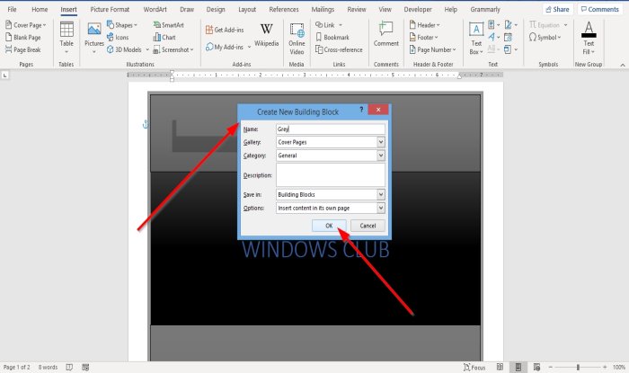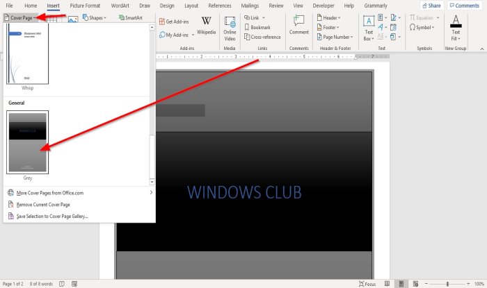 Para encontrar una portada personalizada, haga clic en la pestaña Meter en(Meter en) luego haga clic Primera página(Cubrir) en el grupo paginas(Páginas) desplácese hacia abajo hasta que vea su portada personalizada.