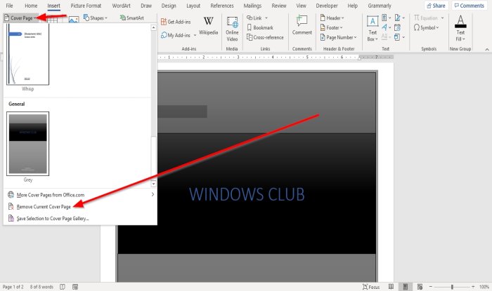 En la lista desplegable, haga clic en eliminar la portada actual(Eliminar portada actual) .