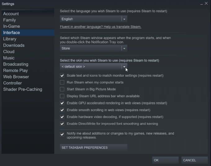 - Abre Steam y ve a Vapor > Ajuste( Ajustes ) > Interfaz(Interfaz) .