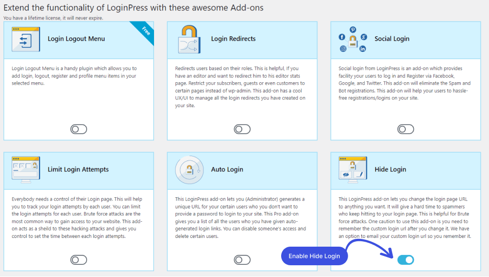 Luego, debe encontrar el complemento Ocultar inicio de sesión y habilitar el botón para activar el complemento Ocultar inicio de sesión.