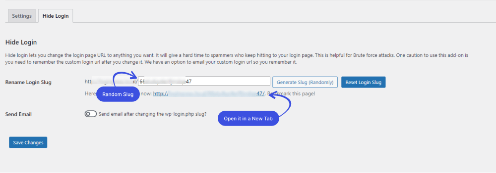 Encontrará el cuadro Renombrar slug de inicio de sesión en la pestaña Ocultar inicio de sesión. Tiene dos opciones aquí: ingrese cualquier slug de inicio de sesión usted mismo o genere un slug aleatorio complejo simplemente haciendo clic en Generar slug (aleatorio).
