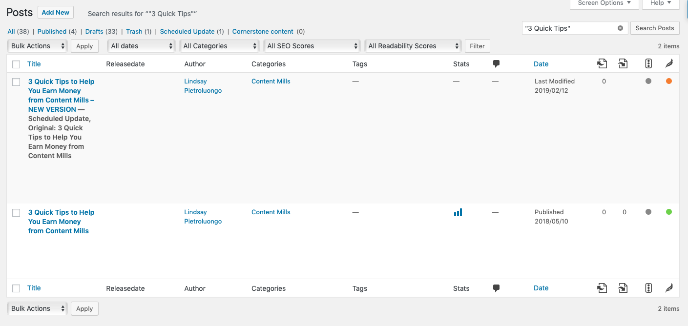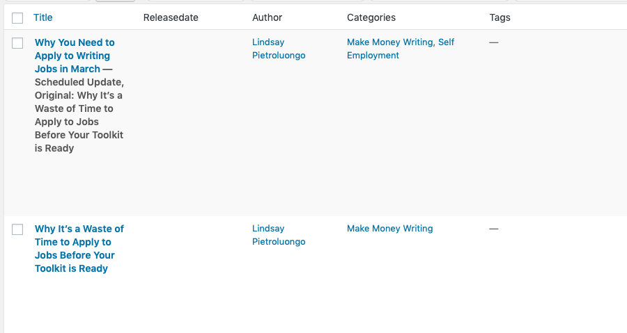 Sin embargo, si regresa a las publicaciones y luego a todas las publicaciones, verá una nueva versión de la publicación del blog con «Actualización programada» debajo.