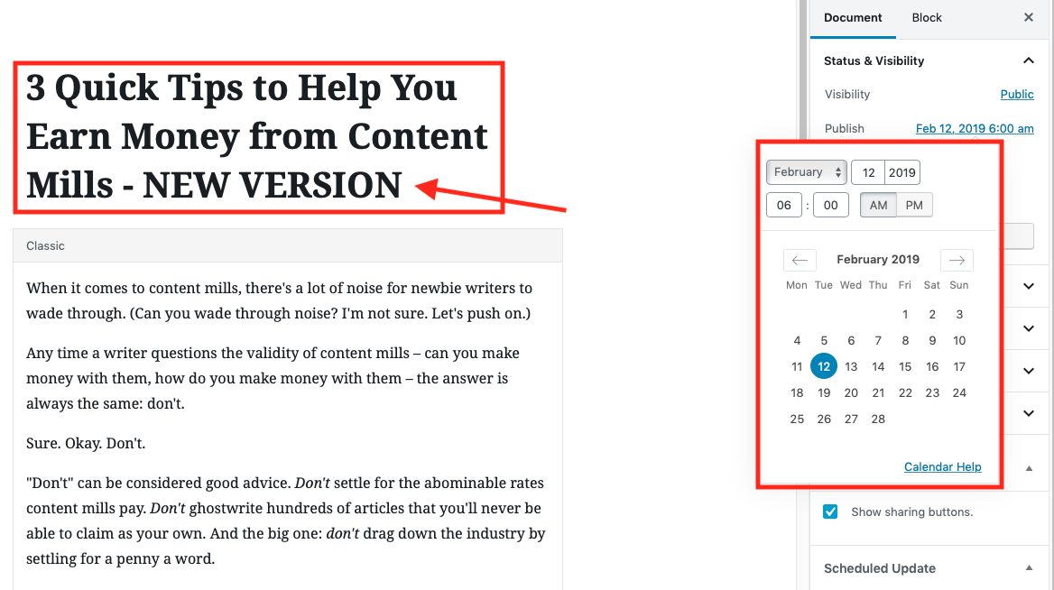 El problema que encontré cuando eliminó la publicación original de mi blog y publicó una nueva antes de mi horario elegido podría ser perjudicial para su sitio web. Solo parecía un problema si estaba editando una publicación ya actualizada. La solución es ingresar solo una ronda de edición de una publicación de blog, programarla y luego dejarla en paz. Si necesita programar otra ronda de actualizaciones, su opción más segura es esperar hasta que la primera ronda esté disponible.
