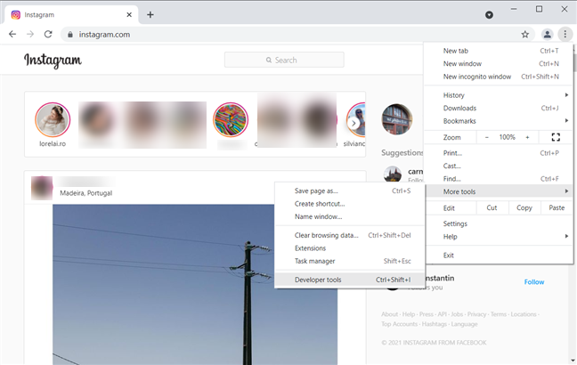 Abra Google Chrome, visite instagram.com e inicie sesión en su cuenta. Entonces necesitas encender herramientas de desarrollo(Herramientas de desarrollo) emular un navegador móvil y acceder a las herramientas de publicación necesarias Instagram . Para hacer esto, haga clic en los tres puntos verticales en la esquina superior derecha para abrir Menú «Personaliza y controla Google Chrome»(«Personaliza y controla Google Chrome») . luego seleccione Más herramientas(Más herramientas) seguido por Herramientas de desarrollo(herramientas de desarrollo) . Alternativamente, puede presionar CTRL + MAYÚS + I en el teclado para obtener el mismo resultado.