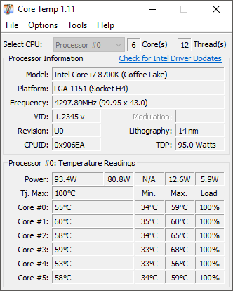 Si tu mantienes Temperatura del núcleo abierto al mismo tiempo, verá que la temperatura sube en segundos.
