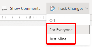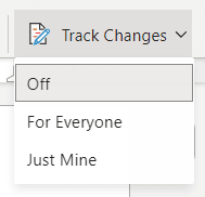 - Seleccione el botón Seguimiento de cambios(Track Changes) y seleccione Para todos(For Everyone) para realizar un seguimiento de los cambios que cualquier persona realiza en este documento o Solo mío(Just Mine) para realizar un seguimiento únicamente de los cambios que usted(you) realiza en el documento.