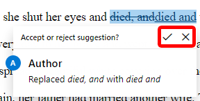 - Cuando se resalta una sugerencia, seleccione el botón Aceptar(Accept) para aceptar el cambio o el botón Rechazar(Reject) para rechazar el cambio y pasar a la siguiente sugerencia.