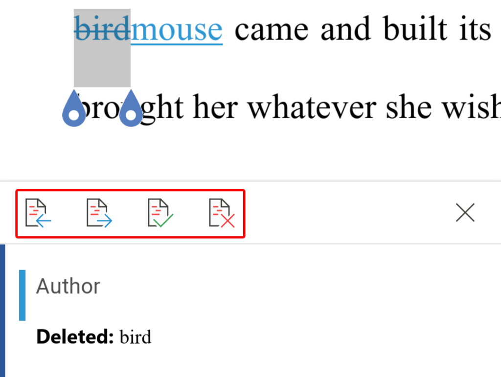 - Desplácese hacia abajo hasta la sección Seguimiento de cambios(Track Changes) y use las flechas de navegación del documento(document navigation) para pasar de una sugerencia a otra. (Alternativamente, toque cada sugerencia en el cuerpo del documento).