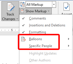 - En la pestaña Revisar , seleccione (Review)Mostrar marcado(Show Markup) . Aquí puede elegir dónde desea ver las sugerencias (en globos o en línea). También puede optar por ver solo sugerencias de personas específicas.