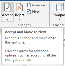 - Seleccione el botón Aceptar(Accept) o Rechazar( Reject) y Word saltará al primer cambio sugerido en el documento.