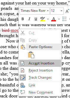 - Seleccione el botón Aceptar(Accept) o Rechazar(Reject) para aceptar o rechazar el cambio sugerido. Si lo desea, puede pasar el mouse sobre el cambio para activar una ventana emergente donde puede ver una descripción del cambio y botones(change and buttons) para aceptar (marca de verificación) o rechazar (X) el cambio. Tenga en cuenta, sin embargo, que si utiliza esta interfaz, Word no avanzará automáticamente al siguiente cambio sugerido.