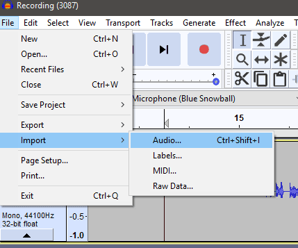 Con estos consejos en mente, es hora de abrir Audacity . Una vez(Once) dentro de Audacity , haga clic en Archivo, Importar, Audio. (File, Import, Audio. )Navegue hasta el audio que desea importar y haga clic en Abrir(Open) .