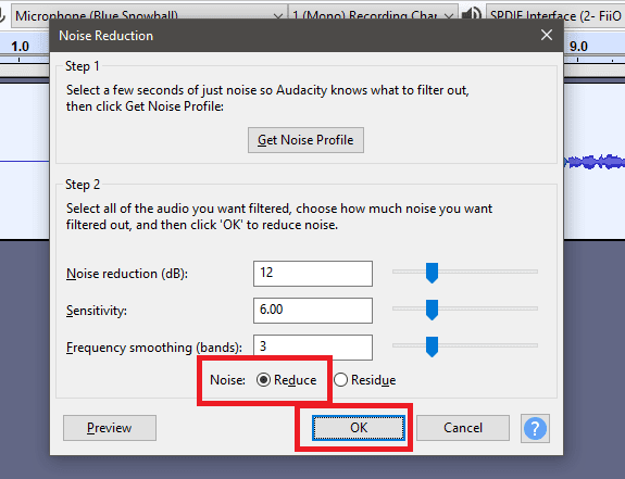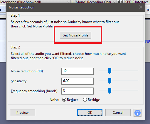 Aparecerá una ventana emergente. En esta ventana, haga clic en Obtener perfil(Get Noise Profile) de ruido y asegúrese de que el audio vacío aún esté resaltado.