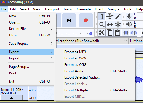 Una vez que haya terminado, puede hacer clic en File > Export y luego Exportar(Export) como un tipo de archivo de su elección. De forma predeterminada, tendrá MP3 , WAV y algunos otros archivos de audio disponibles. Si no está seguro de qué usar, le sugiero MP3 .