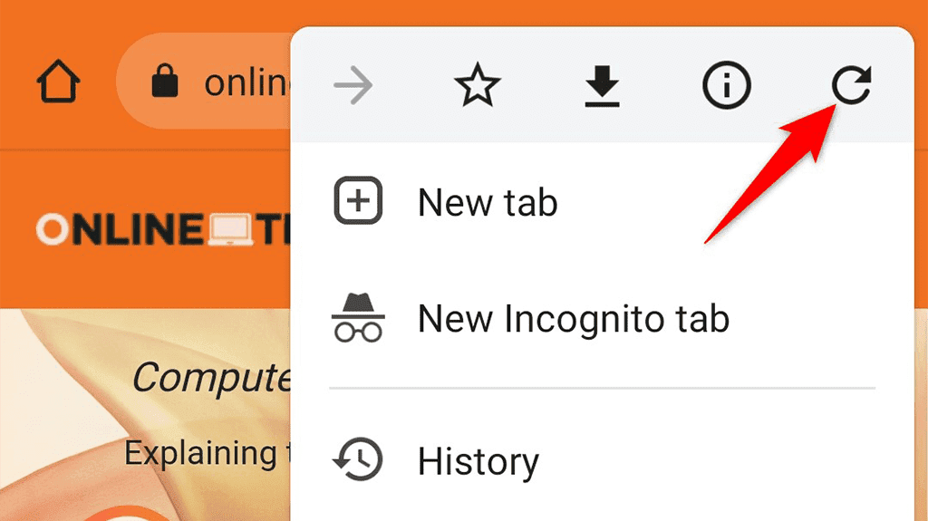 En la mayoría de los navegadores, puede actualizar un sitio tocando el icono de actualización en el menú del navegador.