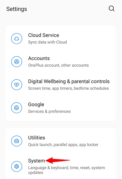 - Desplácese hacia abajo y toque Sistema(System) en Configuración.