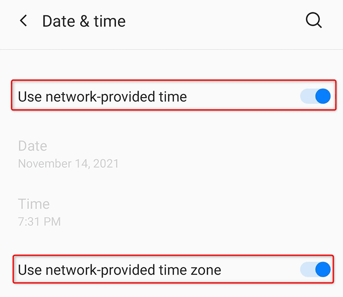 - Active las opciones Usar hora proporcionada por la(Use network-provided time) red y Usar zona horaria proporcionada por la red .(Use network-provided time zone)