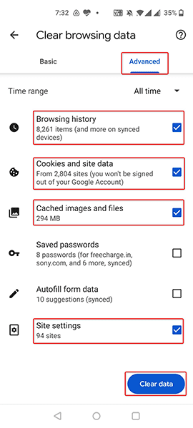 - Seleccione la pestaña Avanzado , habilite (Advanced)Historial(Browsing history) de exploración , Cookies y datos del sitio(Cookies and site data) , Imágenes y archivos en caché(Cached images and files) y Configuración del sitio(Site settings) . Luego, toca Borrar datos(Clear data) .