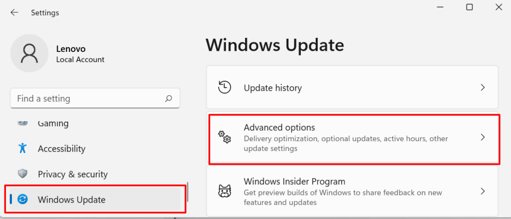 - Dirígete a la pestaña Actualización de Windows en la barra lateral izquierda y selecciona (Windows Update)Opciones avanzadas(Advanced options) .