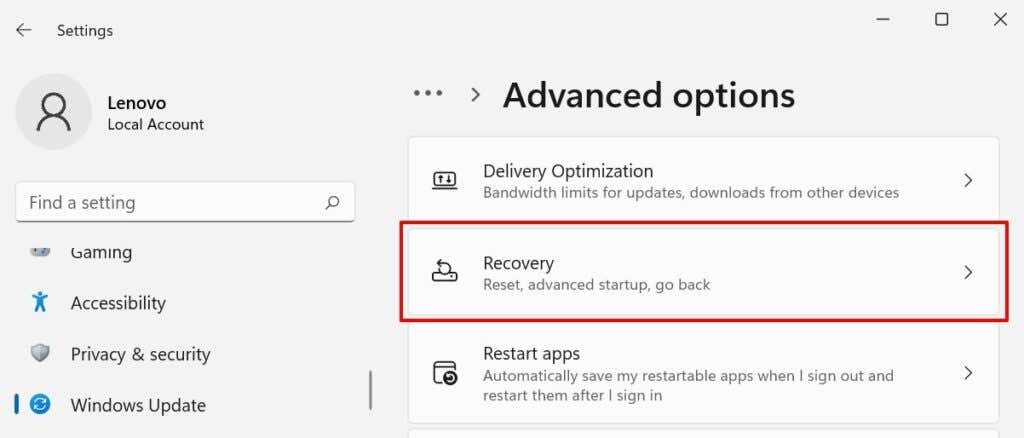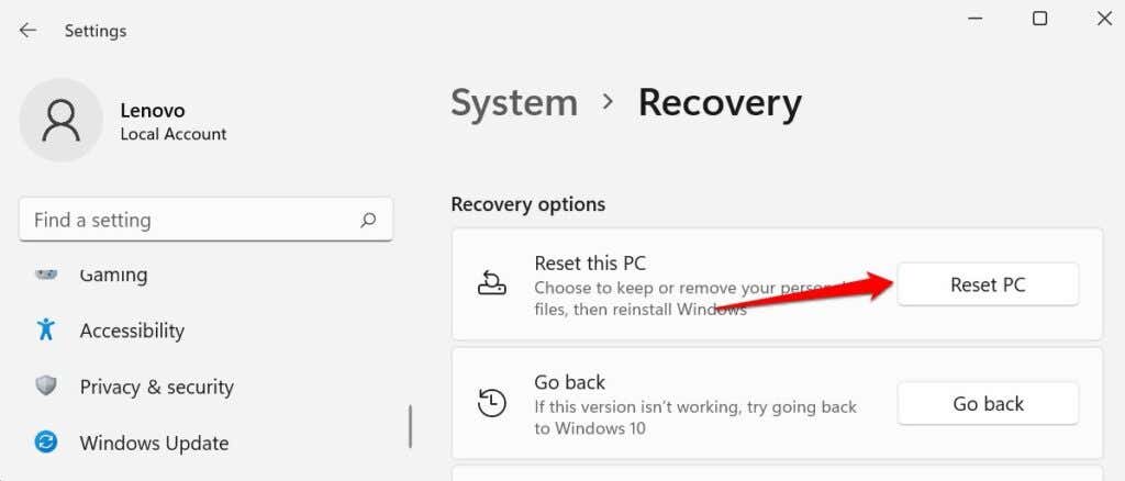 - Desplácese hasta la sección «Opciones de recuperación » y seleccione (Recovery)Restablecer PC(Reset PC) .