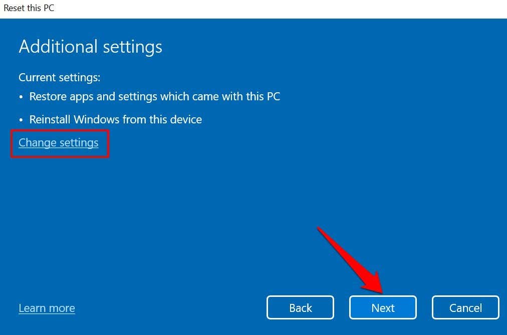 - Obtenga una vista previa(Preview) de la configuración de restablecimiento de fábrica y seleccione Siguiente(Next) para continuar. Seleccione Cambiar configuración(Change settings) si desea realizar modificaciones en las opciones de restablecimiento de fábrica.