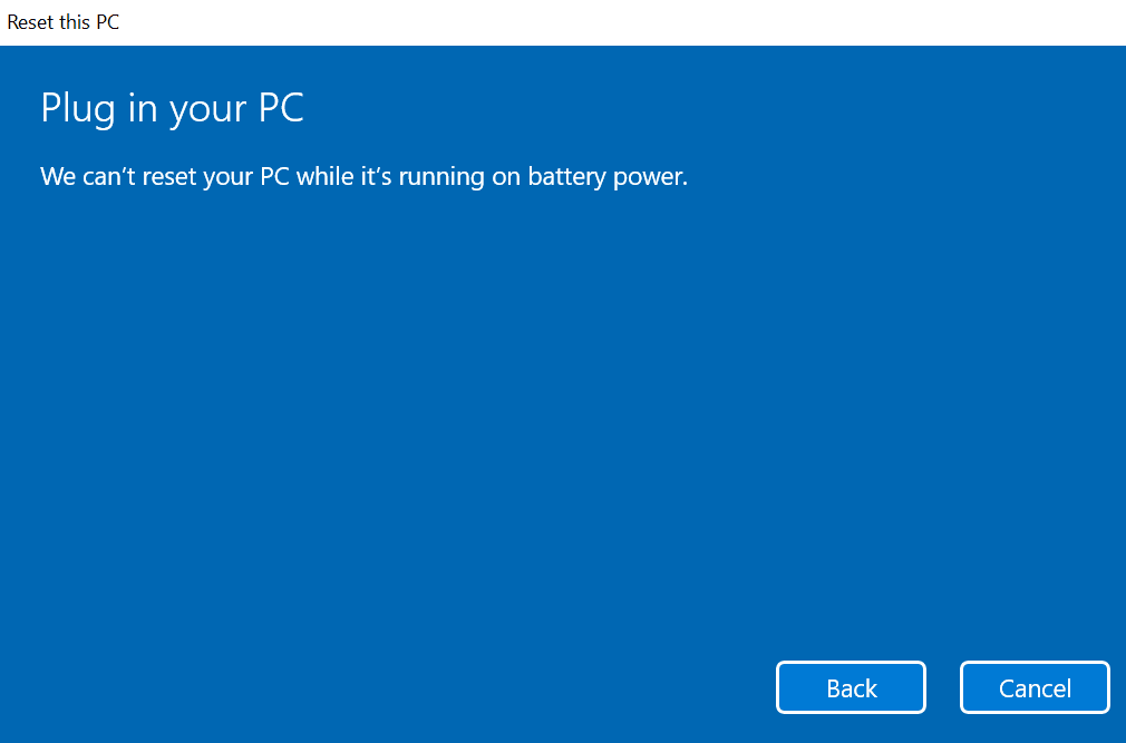 Nota:(Note:) No puede restablecer la configuración de fábrica de Windows 11(Windows 11) mientras su PC está funcionando con batería. De lo contrario, obtendrá un mensaje de error » Conecte(Plug) su PC».