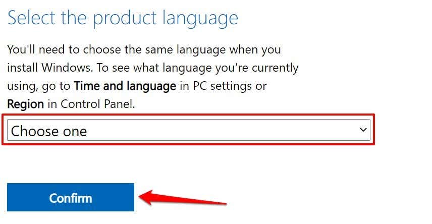 - Seleccione el menú desplegable Elegir uno , seleccione un idioma y seleccione (Choose one)Confirmar(Confirm) para iniciar la descarga.