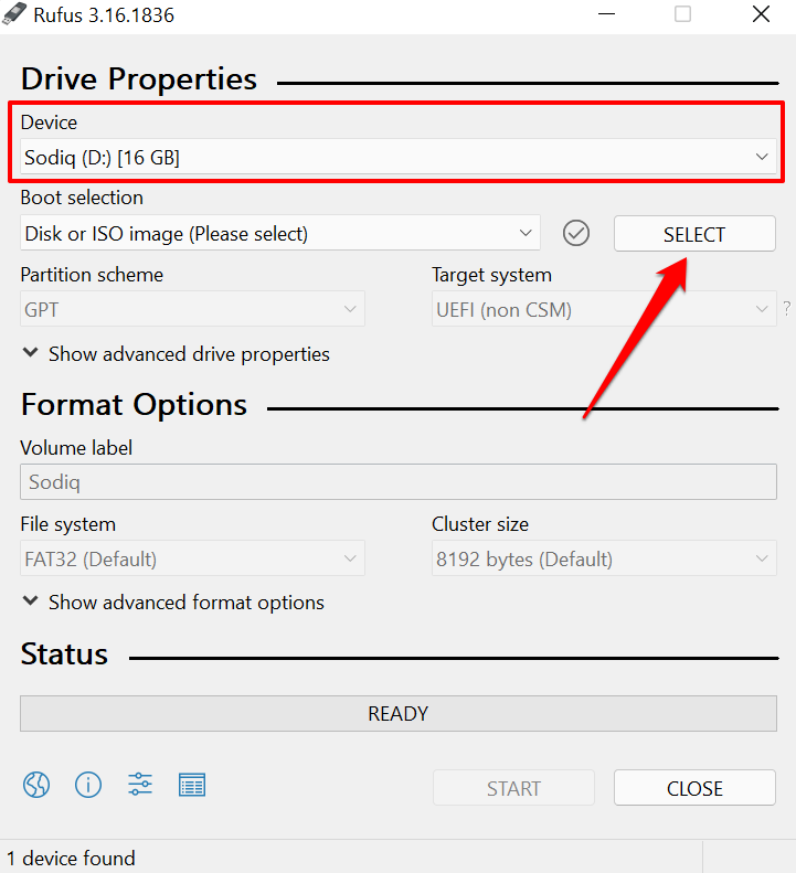 - Descargue el archivo de instalación de Rufus(Download Rufus’ setup file) desde el sitio web del desarrollador y ejecútelo en su PC. La herramienta debería detectar automáticamente su unidad USB en la sección «Dispositivo». Seleccione el botón Seleccionar(Select) para continuar.