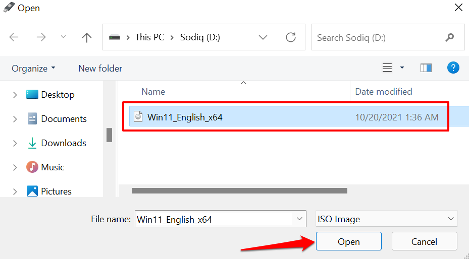 - Dirígete a la ubicación ISO de Windows 11(Windows 11) en tu PC, selecciona el archivo y selecciona Abrir(Open) .