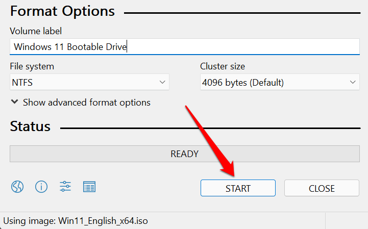 - Seleccione Iniciar(Start) para crear la unidad de arranque.