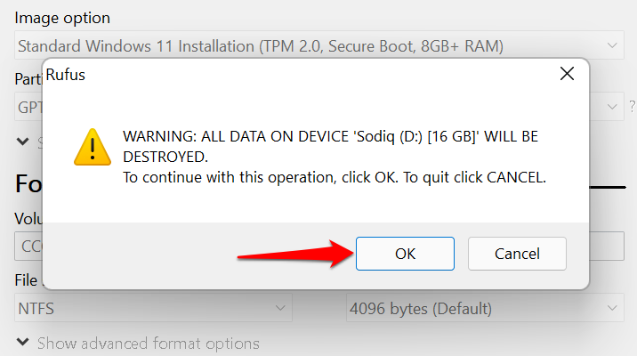 - Tenga en cuenta que la operación borrará todos los datos de la unidad USB . Seleccione Aceptar(OK) para continuar. De lo contrario, seleccione Cancelar(Cancel) , haga una copia de seguridad de todos los datos importantes en el disco y reinicie el proceso.